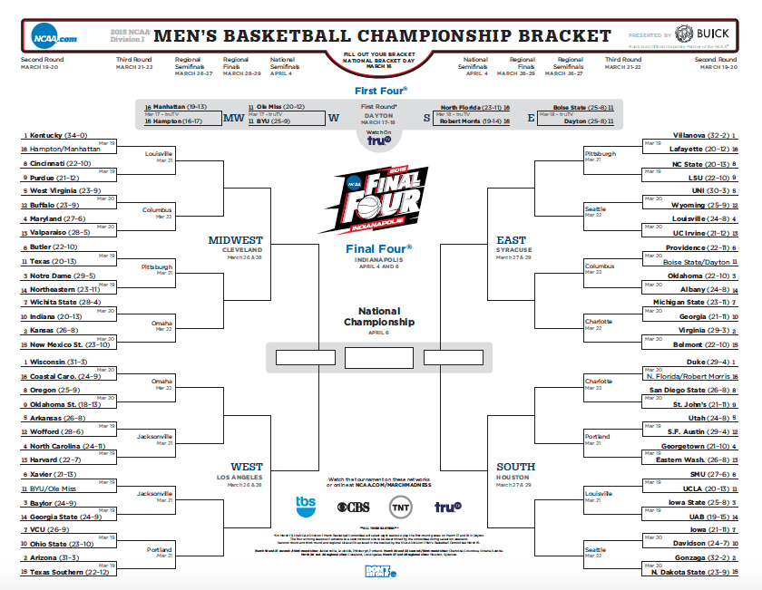 As I write this post on Friday, March 20, the NCAA Men’s Basketball Tournament is in full swing. Like most everyone else who filled out a bracket, mine was already thoroughly busted yesterday, when two 3-seeds (Iowa State and Baylor) were beaten by 14-seeds (University of Alabama Birmingham and Georgia State). Some small consolation comes from the knowledge that out of 11.57 million bracket entries on ESPN, only 273 (that’s 0.0024%!) were still correct after the first day of tournament play!