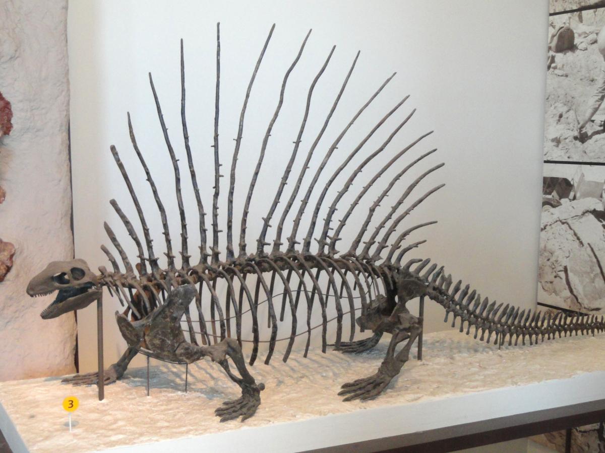 So Edaphosaurus is a non-mammalian synapsid. There are lots of them, but one particularly interesting thing about Edaphosaurus in particular is that, from studying its teeth, paleontologists know that Edaphosaurus was a plant-eater—and in fact it is one of the first vegetarian tetrapods known. It was first described by American paleontologist (and “Bone Wars” participant) Edward Drinker Cope in 1882. Edaphosaurus, like Dimetrodon, had a large sail on its back supported by elongated vertebral processes. The leading theory is that these sails aided in temperature regulation, and this idea is supported by the clear marks left by blood vessels going up and down the bony supports.