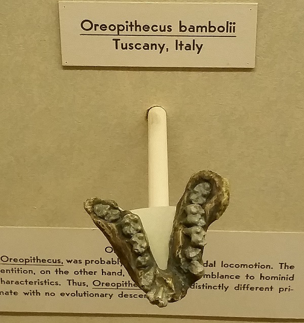 This week, as I start to make some early preparations for Darwin’s birthday, I’ll reveal that we are dealing with an extinct hominoid from the Miocene epoch, Oreopithecus bambolii. When I see the word hominoid I think of human origins. I selected this specimen because here we’re dealing with an organism that is a hominoid and yet is not one of our ancestors—a branch a bit further off the tree. Many people I run into who are learning about human evolution do not realize that our primate cluster has had many offshoots since it emerged, that not all of them are directly related to each other, and that many hominoid species went extinct long ago.