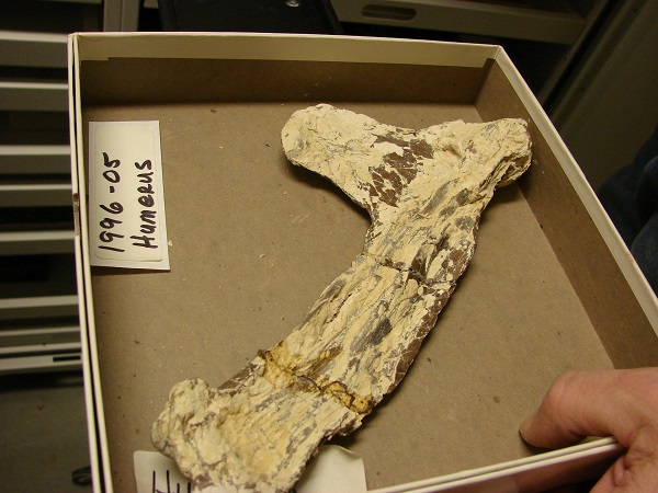 This fossil was collected from the Niobrara of Kansas. This wonderful American fossil site was first explored in the 1870s, and has yielded many excellent and dramatic vertebrate specimens: everything from mosasaurs to pterosaurs. This particular specimen is the humerus of a Pteranodon, species unknown.