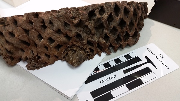 I think it still looks pretty intimidating, but as you can probably tell it is a plant. Specifically, a fossil of Cycadeoidea. There’s a significant amount of controversy about the classifications of species within this genus. At the time this particular fossil was described, it was known as Cycadeoidea dacoit. This specimen is one slice of the holoype (a holotype is the organism used to describe and define the species) of one of the earliest described Cycadeoidea, collected by T.H. MacBride in 1896. These organisms lived during the Jurassic and Cretaceous periods.
