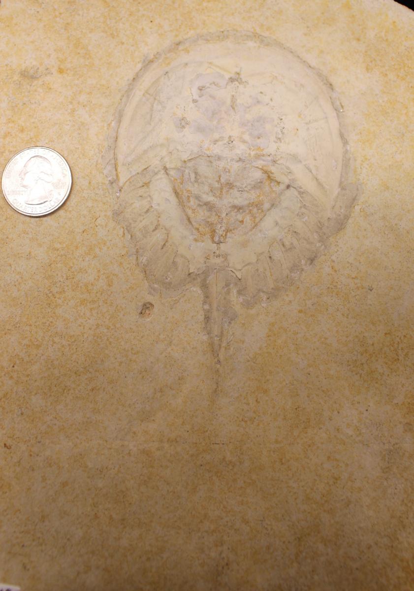 These extremely fine-grained limestone deposits from Germany were formed in warm, calm, shallow, and quite likely anoxic (oxygen-free) lagoons in the late Jurassic (about 155 million years ago). If you remember from earlier fossil posts, shallow anoxic seas are pretty much ideal places for fossilization, and Solnhofen fossils do not disappoint. They are absolutely gorgeous, and the preservation, especially of soft tissues, is remarkable. The Solnhofen is most famous for preserving Archaeopteryx in exquisite detail, but many other types of organisms found their way into these Jurassic lagoons. This critter, for example, is clearly not Archaeopteryx, but rather an extinct arthropod called Mesolimulus walchi. A close cousin to the extant horseshoe crab, M. walchi is best known from the Solnhofen and left behind trackways that kept paleontologists guessing for some time. It wasn’t until a M. walchi was found at the center of a “death spiral” that the trackways’ provenance became clear.