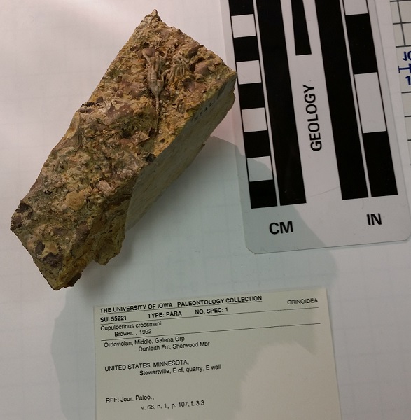 But what was it? A crinoid, as many of you probably guessed, but not just any crinoid. This particular fossil is a holotype specimen for the species Cupulocrinus crossmani, as published in the Journal of Paleontology.