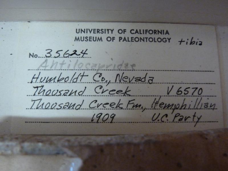 Although sometimes placed in the Bovidae, current practice by most is to keep the Pronghorn in its own family. They share with the bovids the possession of non-deciduous horn cores of bone that are covered by the keratinous horn in life; they differ from all bovids, however, in that the horn sheath is deciduous and branched. The living Pronghorn is exquisitely adapted for cursorial life, including highly successful respiratory and circulatory systems that allows long-distant rapid locomotion. The Pronghorn is considered to be North America's fastest terrestrial mammal. The morphological characters of the extinct Pleistocene forms show osteological adaptations mostly similar to those of the Pronghorn. Molars are highly hypsodont in our representatives, although the modern Pronghorn is not primarily a grazer.”