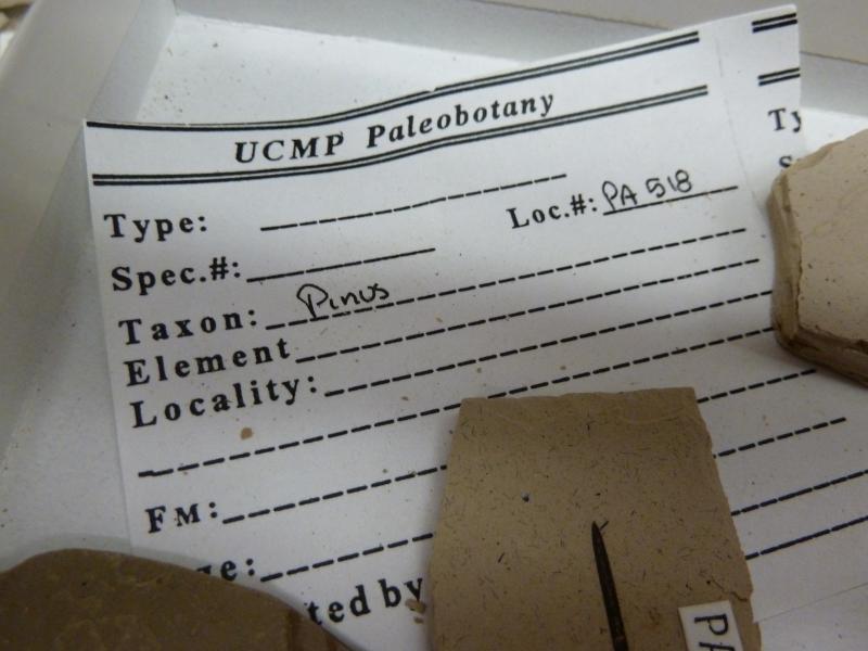 And it was….a needle from the genus Pinus (aka a pine needle). Though the specimen tag did not specify the specific species, the UCMP has an interesting blog post about the Monterey Pine which is found today too: