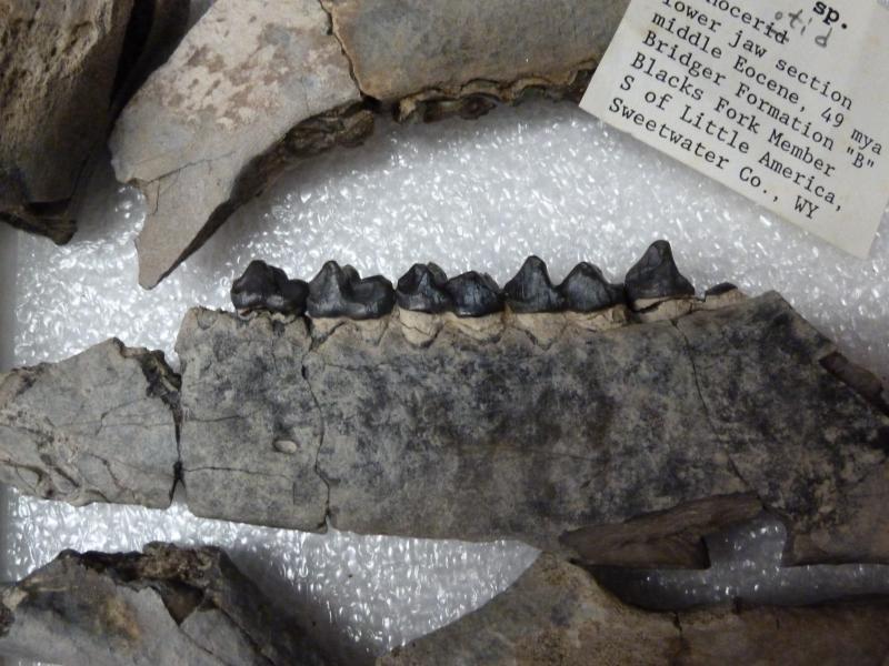 “Hyrachyus eximius is an extinct member of order Perissodactyla (odd-toed ungulates) that lived during the Eocene era (56-34mya). It is the oldest known Rhinocerotid…and is so primitive that it was initially mistaken for an early tapiroid…Its family was a precursor to modern rhinoceroses, and shares a common ancestor with tapirs....H. eximius did not closely resemble either modern rhinos or tapirs; it looked more like a small, slender horse with a large, blunt head. It lacked both the rhino’s horns and the short proboscis (short trunk) of tapirs. It ranged through much of Eurasia and North America.”