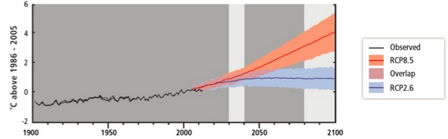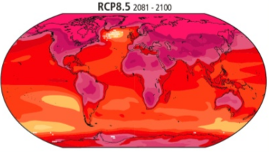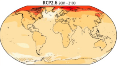 The maps depict the red-hot route, referred to as RCP8.5 and the lukewarm route, known as RCP2.6. (RCP stands for Representative Concentration Pathway. RCP8.5 represents a specific concentration of greenhouse gases that would result in the Earth holding onto 8.5 watts per meter squared of radiant energy. The RCP2.6 scenario represents 2.6 watts per meter squared.)