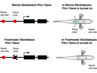 David Kingsley and colleagues (Shapiro et al., 2003) have studied the evolution of sticklebacks. Over the last 10,000 years, marine sticklebacks have invaded freshwater lakes and have undergone an extensive adaptive radiation. One important adaptation in freshwater stickleback has been the reduction of pelvic spines that helps to reduce predation from arthropods. To address what gene(s) are responsible for pelvic spine reduction, Kingsley and colleagues conducted genetic experiments on sticklebacks and showed that mutation in the Pitx1 gene was responsible.