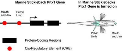 An example of the Pitx1 gene in the marine stickleback fish is shown below. Genetic studies of sticklebacks by David Kingsley and colleagues have established the mutations in Pitx1 have played an important role in the evolution of sticklebacks. There two important CREs controlling Pitx1 expression. One CRE is postulated to control Pitx1 expression in the mouth and jaw while another CRE is postulated to control Pitx1 expression in the pelvic hindlimb.