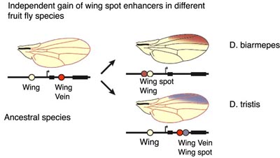As Kingsley and colleagues show, the mutations in a CRE can cause the loss of Pitx1 function in pelvic spines, but can mutations generate new CREs? Sean Carroll and colleagues (Prud'homme et al., 2006) have addressed this question by focusing upon how wing spots have evolved in fruit flies. Wing spots play an important role in mating behaviors of fruit flies and would be predicted to be under strong natural selection. By a functional analysis of wingspot CREs of different fruit fly species, Prud'homme et al. show that CREs responsible for wing spots in fruit flies have been independently gained as shown below. Interestingly, these new CREs have been generated by the modification of pre-existing CREs.