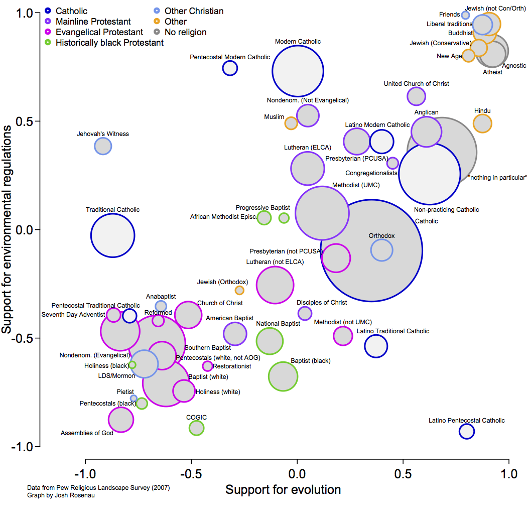 Modern Catholics strongly favor environmental regulation, to a far greater extent than they endorse evolution. Traditional Catholics are evenly split on the environment, but quite resistant to evolution. Latino Catholics as a whole are quite supportive of evolution (more so than Modern Catholics), but there’s a broad range of responses on the environment question among those who are more traditional, more modern, and those who’ve adopted Charismatic and Pentecostal practices into their Catholicism (this borrowing from Protestant traditions is increasingly common, and may bring with it dominionist and millennialist ideologies that decrease concern for Earth). Note that these data are from 2007, before Francis ascended to the papacy, and cultural shifts in the last eight years may have changed some of these patterns already.