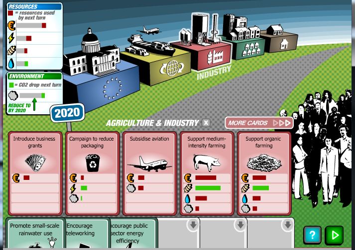 The game is unsurprisingly called Climate Challenge, and it stays true to its name. It opens in 1990, when you, the player, are named president of the European Union and allocated a limited amount of money, energy, food, and water for the EU to utilize through the duration of the game. You are presented with five different policy areas each round: national, trade, industrial, local, and household. Within each policy area, there are different cards with policy options explained on them. The cards depict which resources would be used and which would be gained if you decide to implement the policy. For example, within the industrial category there is