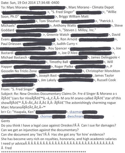 Climate change denier Fred Singer, a subject of the book and movie Merchants of Doubt, writes to a list of prominent climate change deniers, looking for advice on how to silence Oreskes. DeSmogBlog and E&E News obtained the email from a source who received it as a forward.Merchants of Doubt is now a major motion picture from Sony Pictures Classics, and the hard work she and Conway and their colleagues have done will reach an even wider audience. Like the Oscar- and Nobel-winning An Inconvenient Truth, it serves as a rallying point for those concerned about the risks posed by climate change and by science denial, and anyone who has been “on the losing end of a hustle.” In the film and her appearances before film audiences and the media, Oreskes has urged viewers to find ways, however small, that they can get involved in the task of confronting climate change. From her own experience, she acknowledges that people may face criticism and attacks for stepping forward, but that we should not flinch from it. She certainly hasn’t.