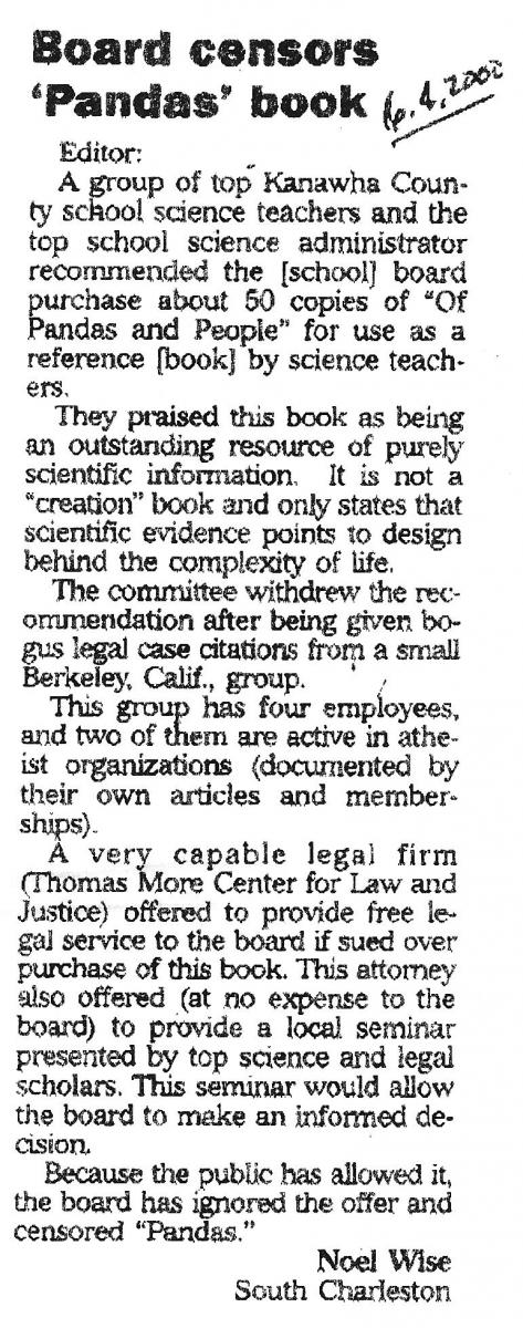 School administrators and teachers in Kanawha County had approved the purchase of fifty copies of the intelligent design book Of Pandas and People, stated the writer of the letter. “They praised the book as being an outstanding resource of purely scientific information.” (No creationism here; no siree, Bob.)
