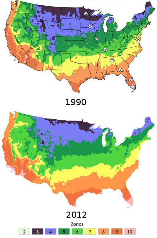 I then described the USDA planting zone guides (reproduced here) that are published every decade or so. They provide quite a striking visual image of what’s happening with our climate. I didn’t have them at hand, of course, but I hope Dr. Skeptic went and looked them up. Because this is what he’d see—notice the shifts north.