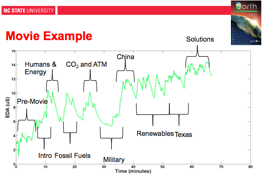 In a creative and novel approach to assessing the effectiveness of different approaches to climate change education, Dr. Karen McNeal of North Carolina State explored the potential for combining the use of lecture, dialogue, movies, and self-reflection in an undergraduate course on climate change. As a means of scientifically tracking the engagment level of the students as they listened to lectures, participated in discussions, and watched a movie, she measured the EDA, or Electrodermal Activity of some of her students.