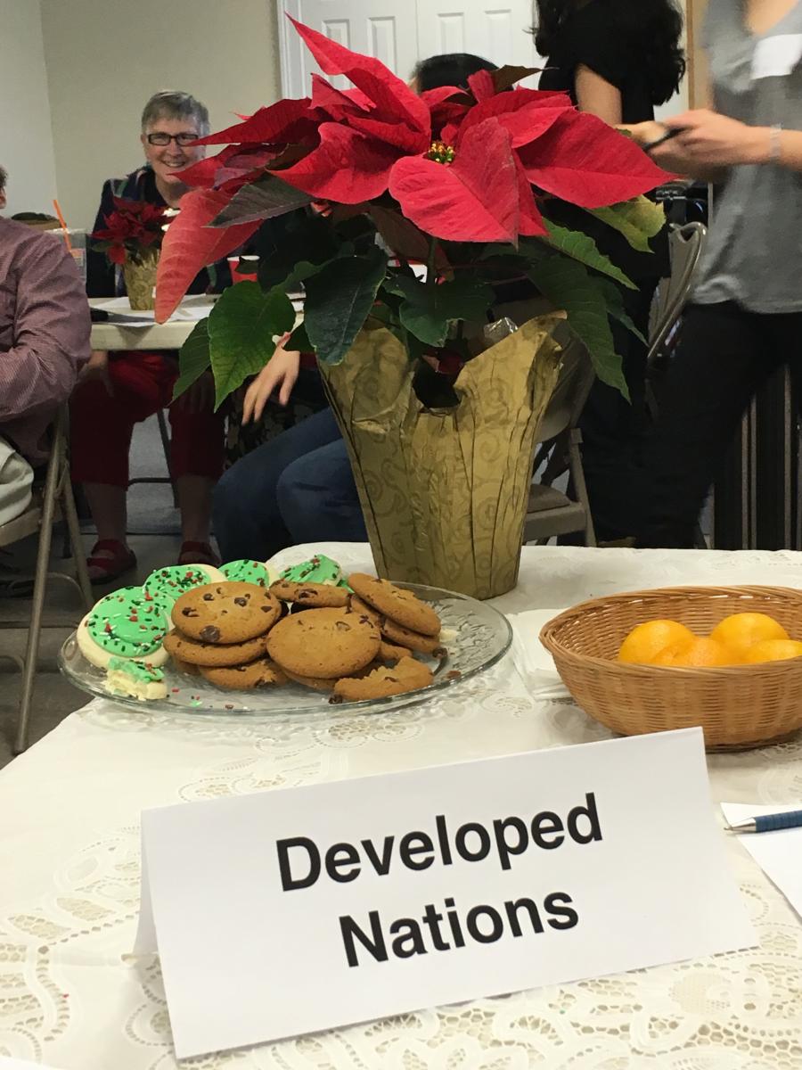 My simulation was run by Noel Zamot from MIT’s Sloan School of Management, one of the organizations that developed the interactive program. The basic set-up is that participants get divided into three groups: “developed nations” (led by the US, EU, Russia, and Japan) “developing A nations” (led by Brazil, India, and China), and “developing B nations” (which includes most of Africa, South and Central America, the Middle East, and small island nations). Once divided up, we experienced immediate stratification. The developed nations got a table with a nice tablecloth, cookies, a big, lovely pointsetta, water, and comfortable chairs. The developing A nations got a table and chairs, but no tablecloth. Cookies, but not such nice ones. A smaller pointsetta. As for developing B representatives, they got cushions on the floor.