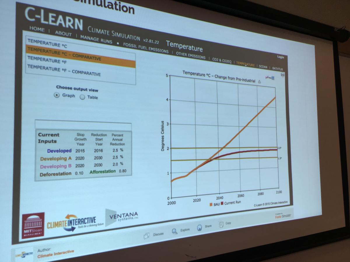 Among all the awesome exhibitions was one standout. Juliette Rooney-Varga and Angélica Allende Brisk’s presentation on the Climate Interactive world climate negotiations simulation was mesmerizing. To accompany their talk, they showed a video. In it, Rooney-Varga is at Cambridge Ringe-Latin school presenting a unit on climate change. The kids are totally bored, disengaged, picking their nails, and staring at the floor. This is despite what Rooney-Varga insists was a really compelling lecture! Then, they begin the simulation. Cut to those same kids in a heated discussion about mandatory carbon reductions and reforestation. They were almost yelling at each other! Not in a “Hey stop that!” kind of way, but more of a “whoa, you guys are into this” way. According to Allende Brisk, they played out the simulation over two days. In the night between sessions these formerly apathetic teenagers watched CSPAN to prepare for day 2. CSPAN! What got them so engaged? What was this simulation and why doesn’t everyone know about it?