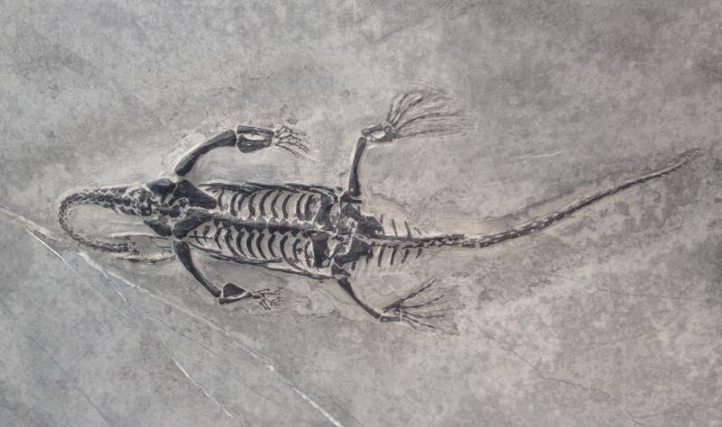 Welcome back to Fossil Friday! We had a great run in 2013: some vertebrates, lots of skulls, many formerly squishy things. To start us off for 2014, I thought I'd challenge you with this full skeleton. This fellow was an aquatic vertebrate, about the length of my hand. Who was this tiny swimmer? Where did it come from? What age did it live in?