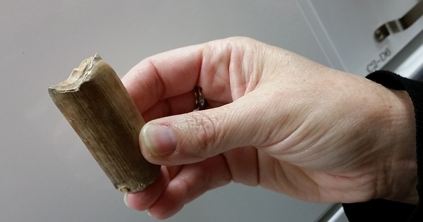So what is this thing the University of Iowa fossil curator, Tiffany Adrain, is holding? This was a particularly nice specimen to touch: really smooth with distinct ridges, it felt almost like it had been carved and polished. Just one hint for identification: this fossil didn’t have to travel very far to make its home in the UIowa collections. Identify it in the comments and win bragging rights for the week!