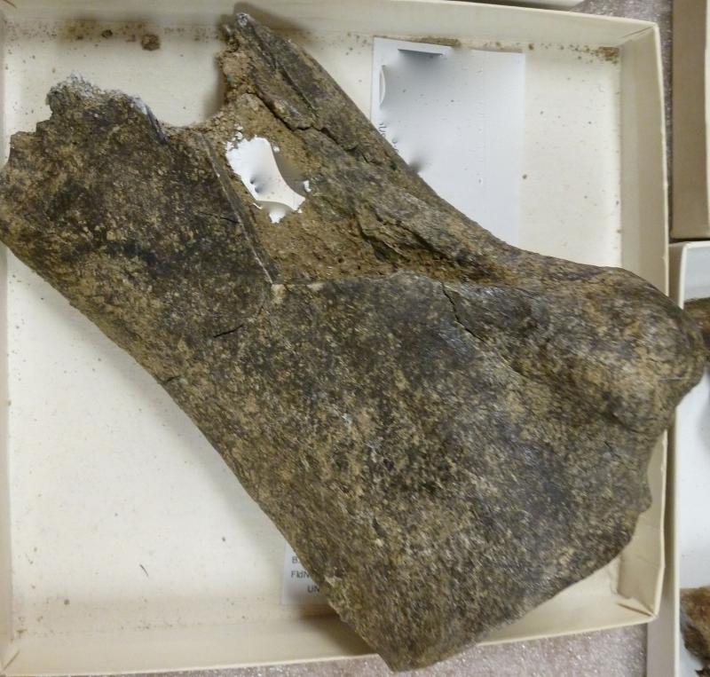 Like a 1960s VW Vagabond van or a classic Cabernet, this fossil has only gotten better with age. And it has had plenty of time to age–dating from the Rancholabrean about 240,000 years to 11,000 years before present. This fossil is actually part of a scapula. What animal could it possibly come from?