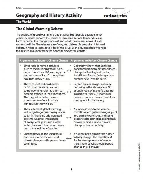 Worse yet, in exploring the textbook further, I located a series of related instructional resources in the textbook (including an interactive web feature which I screengrabbed to the right, and a handout for students, below, click either image to embiggen) which seem to adopt the flawed and error-laden Heartland Institute claims as the textbook’s own view. It’s one thing to present someone’s views in their own words for purposes of discussion, but quite another, as in these handouts and online exercises, to present them without distancing the textbook from the false claims. In both the interactive feature (the top screengrab) and the handout (below), students are given equal numbers of claims that support or "refute" climate change, and students are asked to place them in the right column as if each was of equal validity, relevance, and scientific accuracy. How could students fail to come away from this flawed exercise without the misconception that there is equal evidence for and against the role of humans in climate change? If only the students were asked to check each statement's accuracy against the list of common denialist errors at SkepticalScience.com!