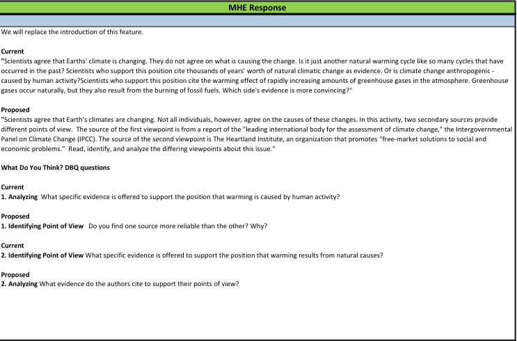 This is not to say that any exercise like this one would be doomed. The exercise could focus instead on an active scientific debate, like how much sea level rise we can expect in the next century. Or if it's necessary to include the Heartland Institute, they've staked out a series of policy positions on how and whether we respond to climate change, which could be contrasted with statements from impartial sources like IPCC or the National Climate Assessment, or from advocacy groups pushing for vigorous responses to climate change. Students could still be asked to evaluate the different viewpoints and examine how sources marshal evidence. But by shifting from a debate about a scientific conclusion to a policy question, the danger of the book reinforcing false scientific claims would be reduced and the book would stay more clearly focused on social studies and how science shapes society, than purely on the science (which is a discussion more appropriate for science classes).