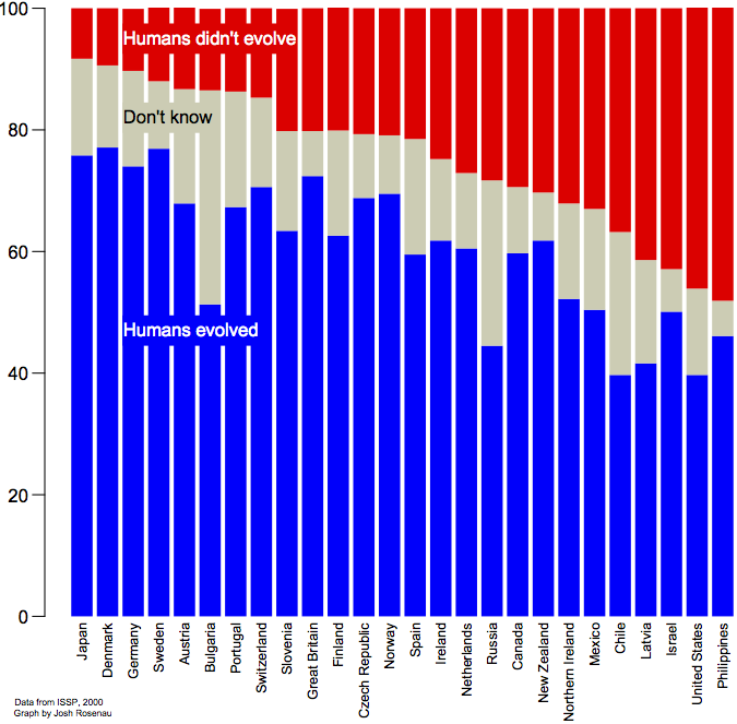 The prospect of battles over evolution in Israel is likelier than one might expect. It was only last year that Israel mandated the addition of evolution to the nation’s secular middle school curriculum (and it remains out of the curriculum for state religious schools). Five years ago, the education ministry’s chief scientist spoke against evolution, leading to his rapid ouster. While the Israeli public is not as anti-evolution as the US, 43% told the International Social Study Programme in 2000 that it is “definitely” or “probably not true” that humans evolved from earlier species of animals. In the same survey, 46% of the US respondents were similarly anti-evolution, with only the Philippines (48%) showing higher rates of evolution rejection.