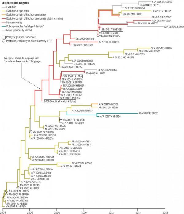 That all changes this year, for the tenth Kitzmas. Today, Science released a prepublication version of “The evolution of antievolution policies since Kitzmiller v. Dover” by former NCSE staffer Nick Matzke, in which he analyzed NCSE’s database of “academic freedom” legislation—the successor strategy to “intelligent design.” And by applying the fancypants evolutionary analysis he learned while getting his post-NCSE PhD, he came up with this tree.