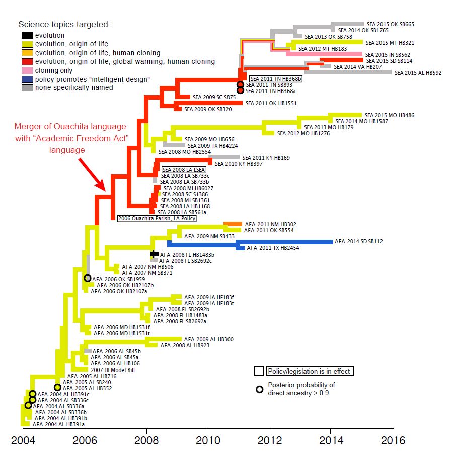In a new paper (PDF; subscription required) forthcoming in Science, Nick Matzke shows that even though creationism is getting stealthier in the wake of legal defeats such as Kitzmiller v. Dover, techniques from modern evolutionary biology reveal how creationist legislation is evolving. Using data collected by NCSE and state-of-the-art phylogenetic analysis, Matzke constructed a phylogenetic tree of seventy-five distinct antievolution bills and policies, reconstructing their genealogical relationships with a high degree of confidence.