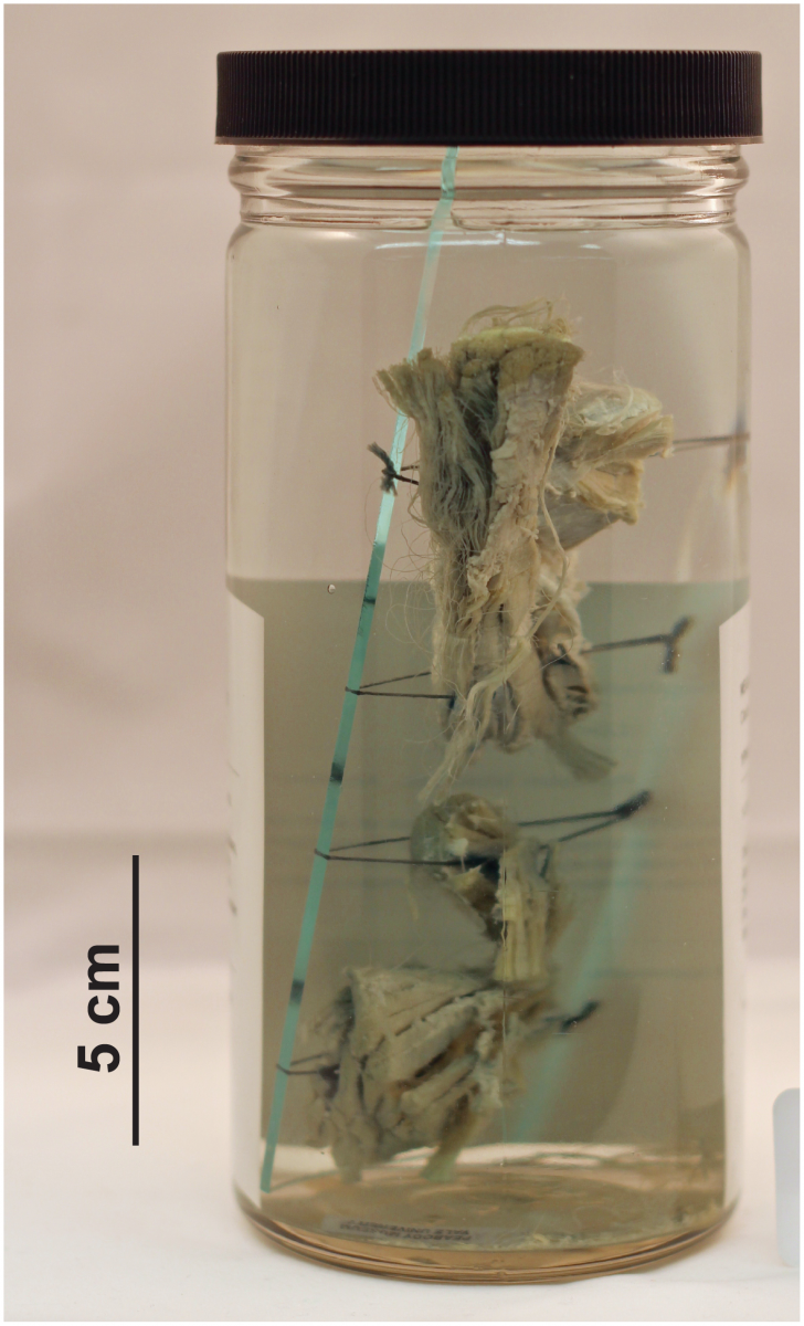 Well, it turns out that a sample of the meat was sent to club member Paul Griswold Howes, who was unable to attend the dinner. Howes wanted to display the prehistoric meal at his museum, the Bruce Museum in Greenwich, Connecticut. The Chairman of the annual dinner committee, Commander Wendell Phillips Dodge, obliged and sent Howes a sample immersed in isopropyl alcohol complete with a specimen tag reading “Megatherium.” In 2001, the Bruce Museum’s collections—including the mystery meat—were integrated with those of the Yale Peabody Museum, where in 2014, a couple of Yale graduate students, Jessica Glass and Matt Davis, decided to try and use modern techniques to determine the meat’s identity.