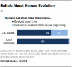 Whereas nearly all scientists say that humans and other living things have evolved over time, only two thirds of the public agrees, according to a new report from the Pew Research Center. Asked which comes closer to their view, "Humans and other living things have evolved over time" or "Humans and other living things have existed in their present form since the beginning of time," 98% of scientists responding chose the former option and only 2% chose the latter option; 65% of the public responding chose the former option and 31% chose the latter option.
