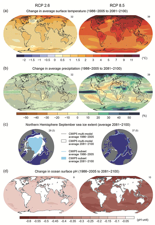 Abridged Caption: Maps of CMIP5 multi-model mean results for the scenarios RCP2.6 and RCP8.5 in 2081–2100 of (a) annual mean surface temperature change, (b) average percent change in annual mean precipitation, (c) Northern Hemisphere September sea ice extent and (d) change in ocean surface pH. Changes in panels (a), (b) and (d) are shown relative to 1986–2005.