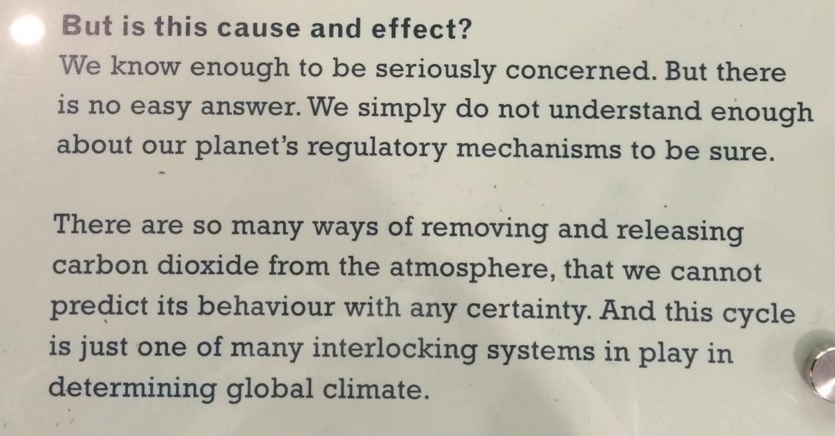 And then Exhibit C. I nearly missed a small sign at the tail end of the “Restless Surface” exhibit on weather and the rock cycle—and we were hurrying at this point because we were in charge of a crew of increasingly impatient toddlers. But it caught my eye because its title was “Global warming?” and I thought to myself…question mark? So I read the text underneath and it said, under a subheading, “But is this cause and effect?”: “We know enough to be seriously concerned. But there is no easy answer. We simply do not understand enough about our planet’s regulatory mechanisms to be sure.”