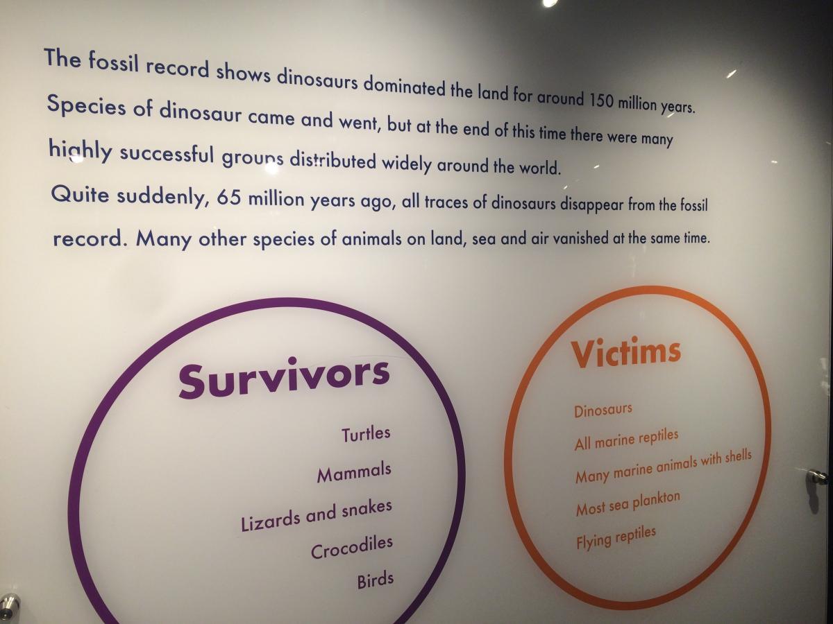 Exhibit A: At the end of the dinosaur hall, in which you are funneled up and around a large hall full of both familiar and not-so-familiar dinosaurs, there is a sign on extinction that says: “Quite suddenly, 65 million years ago, all traces of dinosaurs disappeared from the fossil record. Many other species of animals on land, sea and air disappeared at the same time.” Then, there are two large circles that list “Victims,” including dinosaurs, marine reptiles, and flying reptiles, and “Survivors,” including turtles, mammals, and birds.