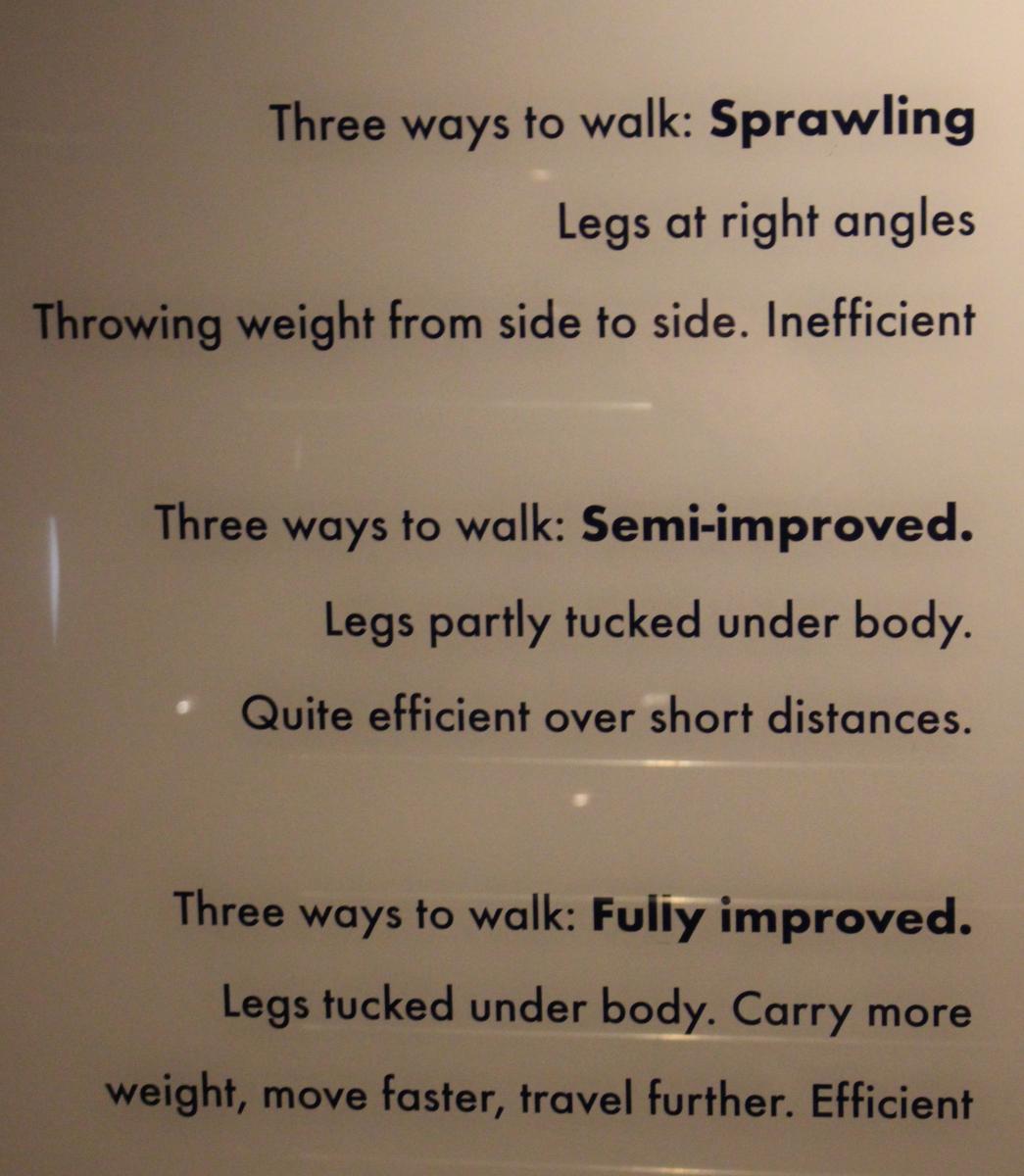 Exhibit B was also found in the dinosaur hall. The lower hall has some wonderful information on dinosaur anatomy and physiology. How do we know how fast dinosaurs grew (bone growth rings!)? How do we know how long they lived (we suspect some got pretty old because they got arthritis!)? That kind of thing. But then there was a display on dinosaur posture that explained that there are three general stances found in the animal kingdom: arms and legs extended out from the hips and shoulders with the belly low to the ground; arms and legs still held away from the body, but somewhat tucked under and held a bit straighter, lifting the animal up off the ground a little; arms and legs oriented right under hips and shoulders and more or less perpendicular to the ground. Picture an iguana, a crocodile, and a dinosaur. I have always heard these three general categories described as sprawling, semi-erect, and erect. This sign, however, used the terms sprawling, semi-improved, and fully improved.