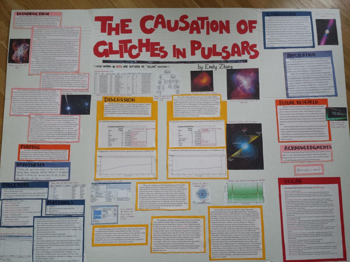 Emily Zhang: Last year, my sophomore year, I was taking AP Biology. Participation in the science fair was required of all students taking AP science classes in my high school—but the topics were up to us. I was looking for an exciting project that would keep me absorbed for a long time. I’ve always loved astronomy, so I talked through my ideas with the astronomy teacher at my school (Kelly Kilts). Although some topics had already been extensively researched, I found that pulsars were relatively unexplained, and decided to make them my focus! One of the categories in an on-line pulsar database was “Number of glitches,” which completely mystified both Ms. Kilts and me. As I looked more into what glitches were—and realized there wasn’t that much research out there—I grew more and more excited about them!