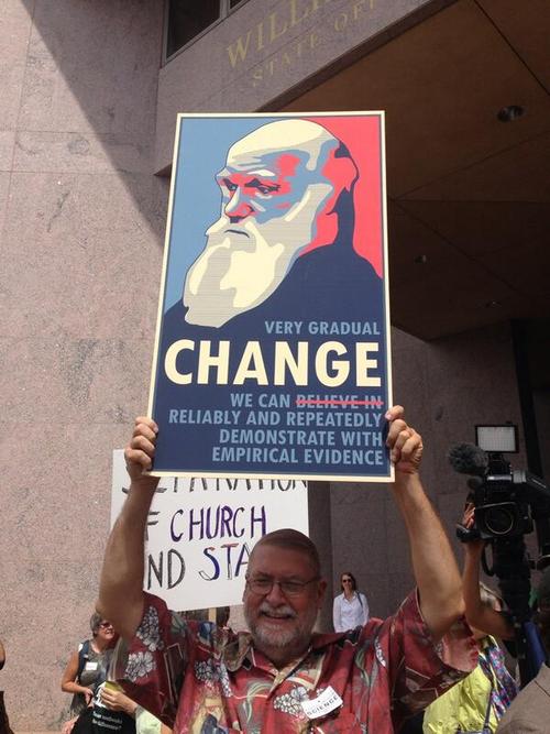 So thanks to all of the good guys who showed up. Steve Schafersman of Texas Citizens for Science valiantly held forth for good science, as usual, and live-blogged the hearings. He was joined by Zack Kopplin, Arturo de Lozanne, Aron Nelson, Ron Wetherington, John Blanton, and many others. Of course Texas Freedom Network did its usual sterling work, including a public records request that revealed the creationists presence on the review committee. TFN also live-blogged the hearings.