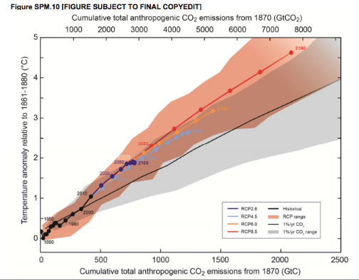 Figure SPM.10: Global mean surface temperature increase as a function of cumulative total global CO2 emissions from various lines of evidence. Multi-model results from a hierarchy of climate-carbon cycle models for each RCP until 2100 are shown with coloured lines and decadal means (dots). Some decadal means are indicated for clarity (e.g., 2050 indicating the decade 2041−2050). Model results over the historical period (1860–2010) are indicated in black. The coloured plume illustrates the multi-model spread over the four RCP scenarios and fades with the decreasing number of available models in RCP8.5. The multi-model mean and range simulated by CMIP5 models, forced by a CO2 increase of 1% per year (1% per year CO2 simulations), is given by the thin black line and grey area. For a specific amount of cumulative CO2 emissions, the 1% per year CO2 simulations exhibit lower warming than those driven by RCPs, which include additional non-CO2 drivers. All values are given relative to the 1861−1880 base period. Decadal averages are connected by straight lines.