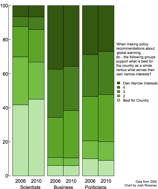 Scientists have the public’s trust by other measures. In 2006 and 2010, when the General Social survey asked (on the National Science Board’s behalf) whether scientists’ recommendations about global warming policy are generally motivated by their own narrow interests or by the greater needs of the nation, people overwhelmingly viewed scientists as impartial, in strong contrast to the perception business leaders and even the politicians elected to represent the nation’s interests. The public trusts scientists, respects scientists, and wants to hear what scientists have to say.