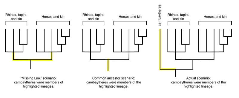 [I]f cambaytheres are so closely related to rhinos and horses, can’t we call them a “missing link?” Because of their position on the Tree of Life. … [I]f cambaytheres were a “missing link,” it would imply that they are part of the ancestral lineage of either horses or rhinos and “link” these two animals to one another. Neither are cambaytheres the common ancestor of horses and rhinos. In fact, cambaytheres are not part of the ancestral lineage of rhinos or horses at all; they are simply close relatives of those ancestors.