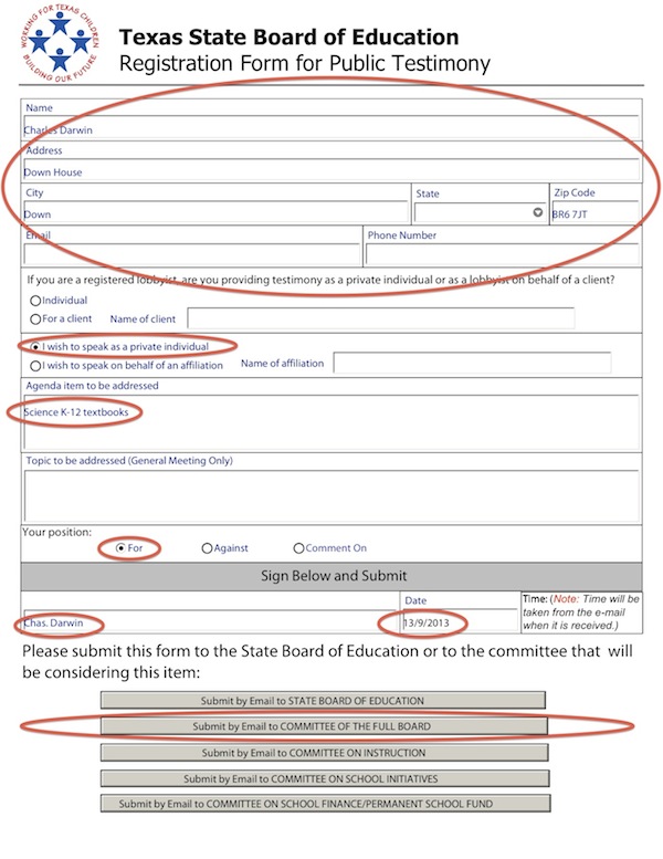 This coming Wednesday will be the last chance for the public to speak about these textbooks. I’ve e-mailed NCSE’s members in Texas, urging them to sign up to speak at the hearing (it starts at 1 on Wednesday) and ask the board to adopt the textbooks without any further changes. I hope that if you’re a Texan reading this, you’ll register to testify now (follow the sample form to the right), or at least attend and show your support for the people speaking up for honest science textbooks (non-Texans, kindly share this with your friends in the Lone Star State). No matter what, now is the time for Texans to contact the board by e-mail and tell them the same.