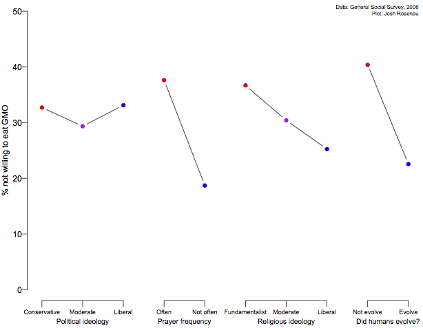 The latter hypothesis seems far more plausible, but I probed the issue using data from the 2006 General Social Survey (a huge biennial survey that explores many issues, including GMO safety that year). In that survey, 1 in 3 people who called themselves “extremely liberal” or “liberal” said that they “Will not eat genetically modified food.” The numbers were essentially identical among those who call themselves “extremely conservative” or “conservative.” By contrast, people who pray at least once a day were twice as likely to say they’d refuse to eat GMOs as those who pray less often (38% vs. 18%). 37% of people who call themselves fundamentalists would refuse to eat GMOs, compared to 25% of those who consider themselves religious liberals. Given all that, it isn’t surprising that 40% of those who reject evolution say they are not willing to eat GMOs, compared to 22% of those who accept it.