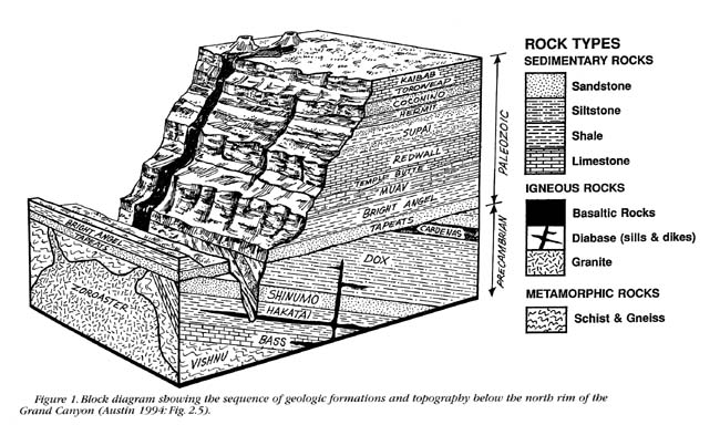 The broad stratigraphic sequence of Grand Canyon rocks is well-established by numerous field observations in Powell's "bible of geology" (Spamer 1989). Powell was, of course, writing figuratively. His "bible" was the rock outcrops themselves. However, Figure 1 is taken from MTC (Austin 1994). Its contributors regard the King James version of the Bible as the true "bible of geology". At first sight, MTC resembles a well-illustrated, geological textbook, replete with maps, technical diagrams, and references to scientific literature. However its aim is to demonstrate unequivocally that the geology of the Grand Canyon is the product of creation week and Noah's flood, as determined by specific "literal" interpretations of the Book of Genesis.