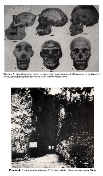 That 1937 paper by Boule, however, was the first printing of what Gish refers to as the "extensive section" (1979:132) on Sinanthropus that later appears in the text of Fossil Men, and the same photograph of Sinanthropus given by Black to Boule appears in both (Boule, 1937:7, fig. 3; Boule and Vallois, 1957:134, fig. 86). This is the same section which Gish suggests was written by Vallois after Boule's death. On the very same page of that paper which Gish cites as the source for his view that the skulls were "monkey-like" (ignoring the fact that the words monkey-like never appear and that the rest of his quote is garbled from several other pages), Boule renders his summary judgment of the Choukoutien discoveries: