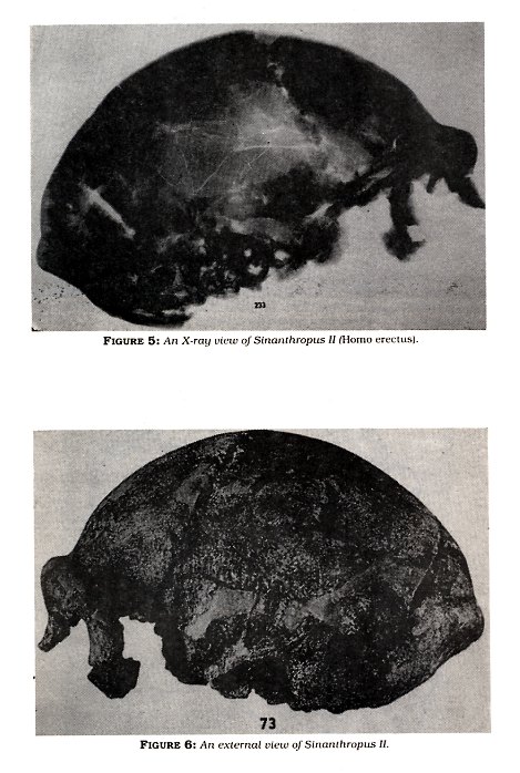 Let us refer to some of the specific evidence. Figures 5 through 7 show some of the massive amount of evidence unearthed at Choukoutein. Compare them with claims that no such evidence exists. If the early discoveries are forgeries, how could the internal structure of a fossil have been faked? Figure 5 is an X-ray view of one of the early crania showing intricate anatomical details. Figure 6 is an external view. The back part of a skull found in 1934 (L3) fits perfectly with a front portion found in 1966 (Figure 7).