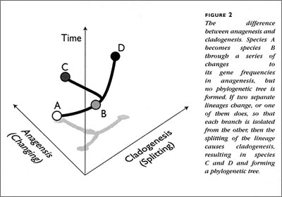 Those who prefer the allele-frequency definition of evolution argue that every such novelty began as minor variations on a theme in the origination of a slightly different species and that large- scale changes are the result of continued evolution of this kind over large periods of time. Often they think that evolution is always gradual (anagenetic) and that evolutionary trees (phylogenies) are just the additive sum of these gradual changes. Nobody denies either cladogenesis or anagenesis these days, but there is a fair bit of debate over the right mix (see Figure 2).