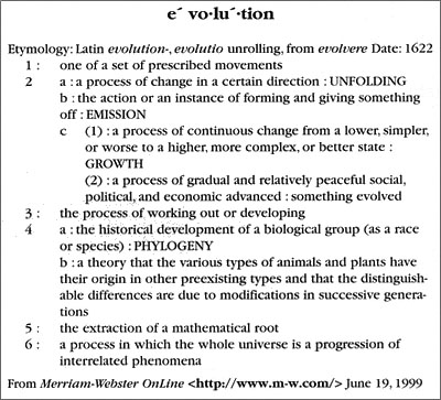 When we try to explain evolution to those who do not know much about it, one of the problems we have is the definition of what counts as evolution. In part, this is because some of the definitions found in the scientific literature, including textbooks and popularizations of evolutionary theory, use technical terms that do not seem to convey to the public that evolution explains the diversity of living forms. In part, it is also because the popular idea of evolution as it is found in dictionaries, science fiction, and philosophical potboilers is a holdover of concepts that have long been abandoned in the biological sciences, if not in theology or in the "science" of popular media.It is important to understand these various definitions relative to each other and to show that accepting evolution as defined in the sciences does not commit one to accepting another form, as proposed by theology or philosophy. In particular it is important to realize that, contrary to many nonscientific uses of the term, evolution is neither a progressive process — modern theory does not make it inevitable that the latest is the best — nor can we expect to be able to predict the "next step" in evolution.