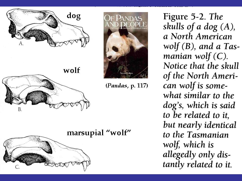 | Slide 84: Figure 5-2 of Pandas (p. 117) compares the skulls of a domestic dog (Canis lupus familiaris, a wolf (Canis lupus) and the marsupial "wolf" (also known as the Tasmanian wolf/Tasmanian tiger, or thylacine; scientific name: Thylacinus cynocephalus), a dog-sized marsupial carnivore. The standard evolutionary phylogeny says that the thylacine is more closely related to a kangaroo than a dog, and dogs and wolves are more closely related to humans and other placental mammals (whales, bats, etc.) than to any marsupial. Pandas says this relationship is doubtful and arbitrarily determined, claiming that the skulls of thylacines and wolves are more similar to each other than to their allegedly marsupial and placental relatives. |