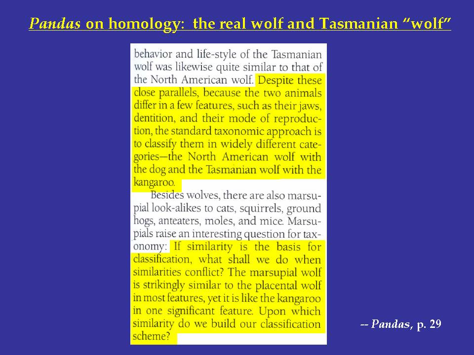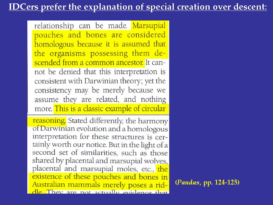 | Slide 101: Pandas claims that using homology to support common ancestry is circular reasoning, again ignoring that marsupial homologies extend far beyond just the pouch, and that DNA sequences have independently confirmed the longstanding conclusion of the morphologists. |